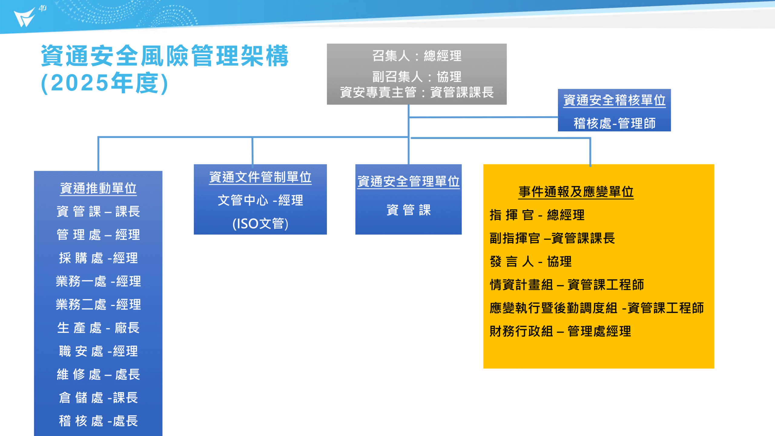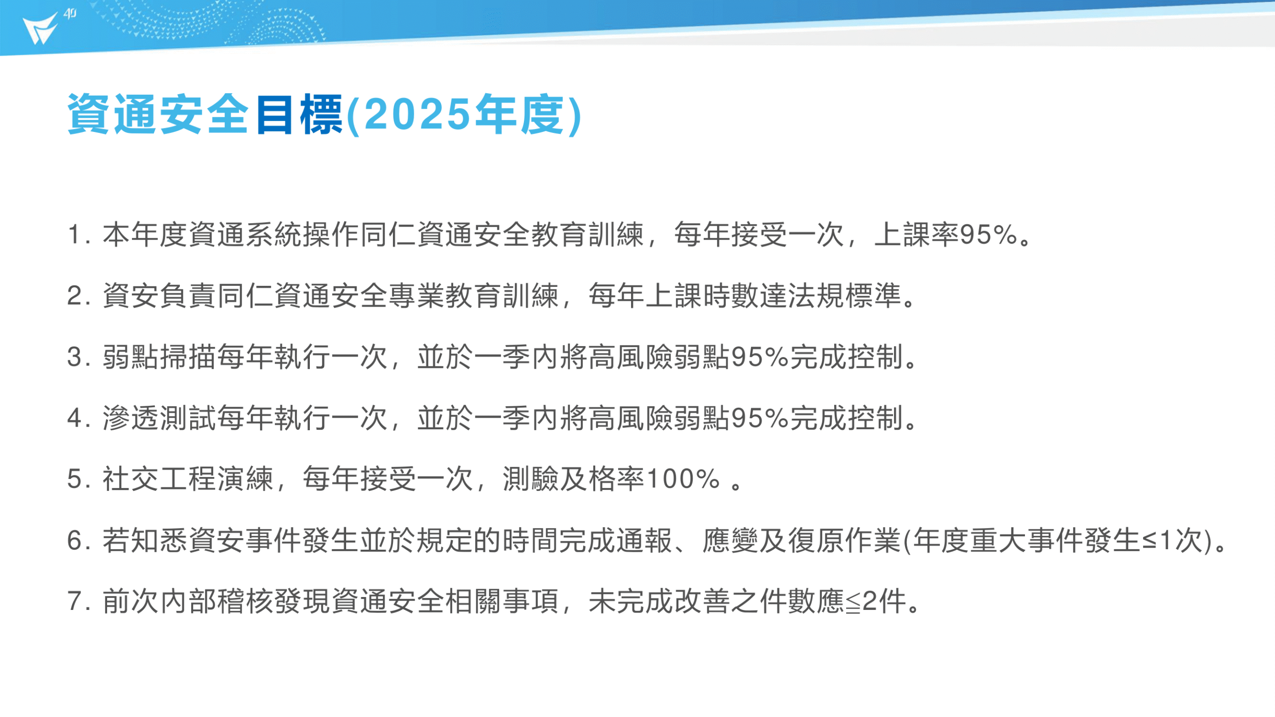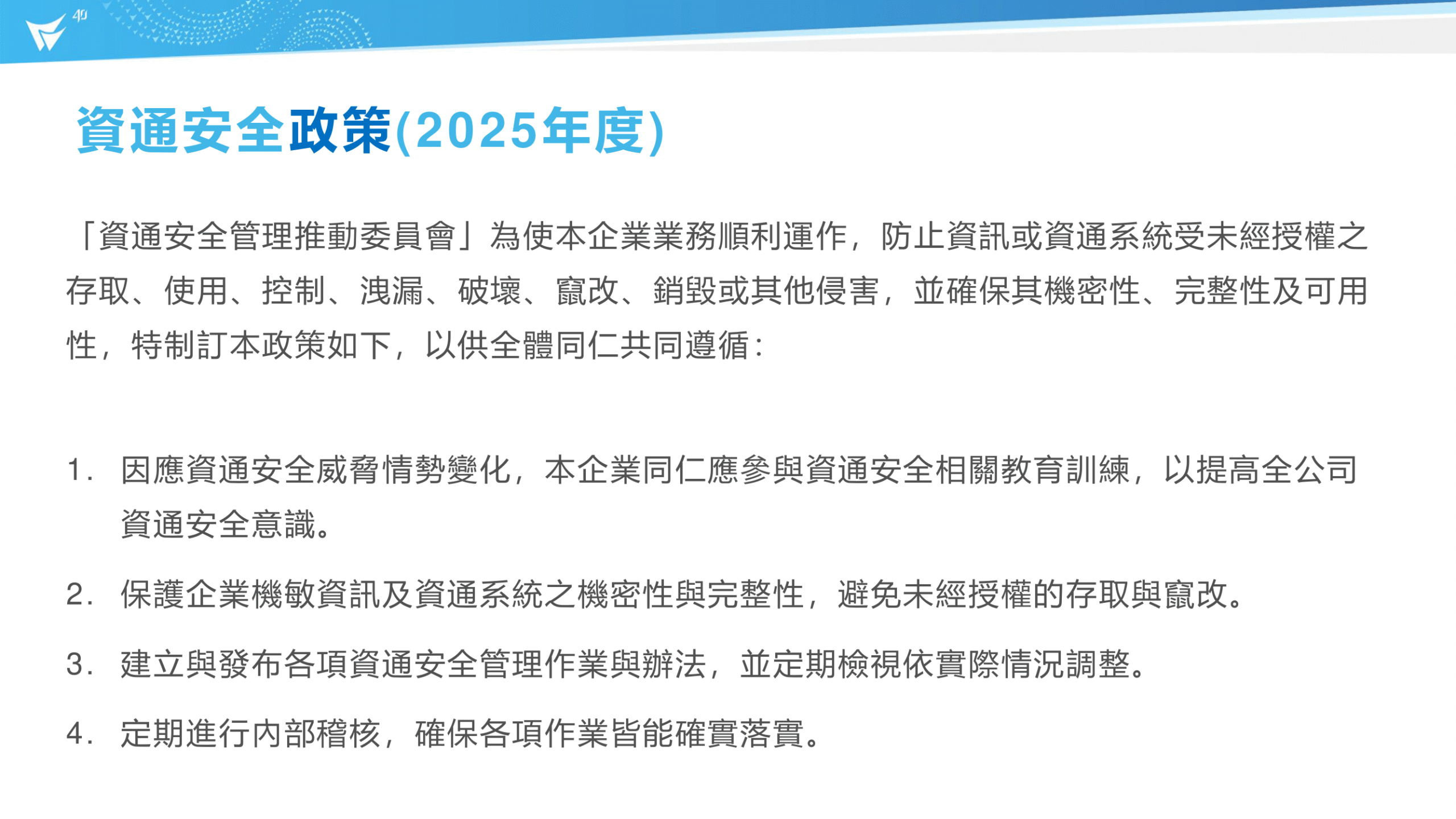 資安政策 Home / 公司治理 / 資安政策 選單經營者的話 永續發展目標 管理方針及亮點 公司治理概況 產品與經濟績效 重大主題管理 氣候變遷 資安政策 公司治理 公司治理 循環經濟 綠色製程 幸福職場 價值鏈管理 社會共融 ESG績效 經營者的話 永續發展目標 管理方針及亮點 公司治理概況 產品與經濟績效 重大主題管理 氣候變遷 資安政策 資安政策 上市上櫃公司資通安全管控指引方案 權責表 組織圖 1120816_內部連絡單答核 1120831_資料安全委員會啟動會議_簽到表 114 年資安通識問卷_考試題目 114 年資安通識問卷_考試成績 資安改善執行項目 上一篇: 氣候變遷 ESG績效 永續報告書 公司治理 經營者的話永續發展目標管理方針及亮點公司治理概況產品與經濟績效重大主題管理氣候變遷資安政策 循環經濟 管理方針及亮點循環經濟推手爐碴再利用新增廢棄物量能成長廢棄物管理鋼聯資源循環經濟貢獻上下游產業鏈共同參與 綠色製程 管理方針及亮點綠色製程系統環境政策與管理系統營運生態效率水風險管理環境監測及法規 幸福職場 管理方針及亮點人力資源管理人才吸引及留才職業安全衛生獎金政策人權政策執行情形 價值鏈管理 管理方針及亮點供應鏈管理運輸安全法規客戶關係管理 社會共融 管理方針及亮點社區衝擊評估社區關懷循環經濟教育