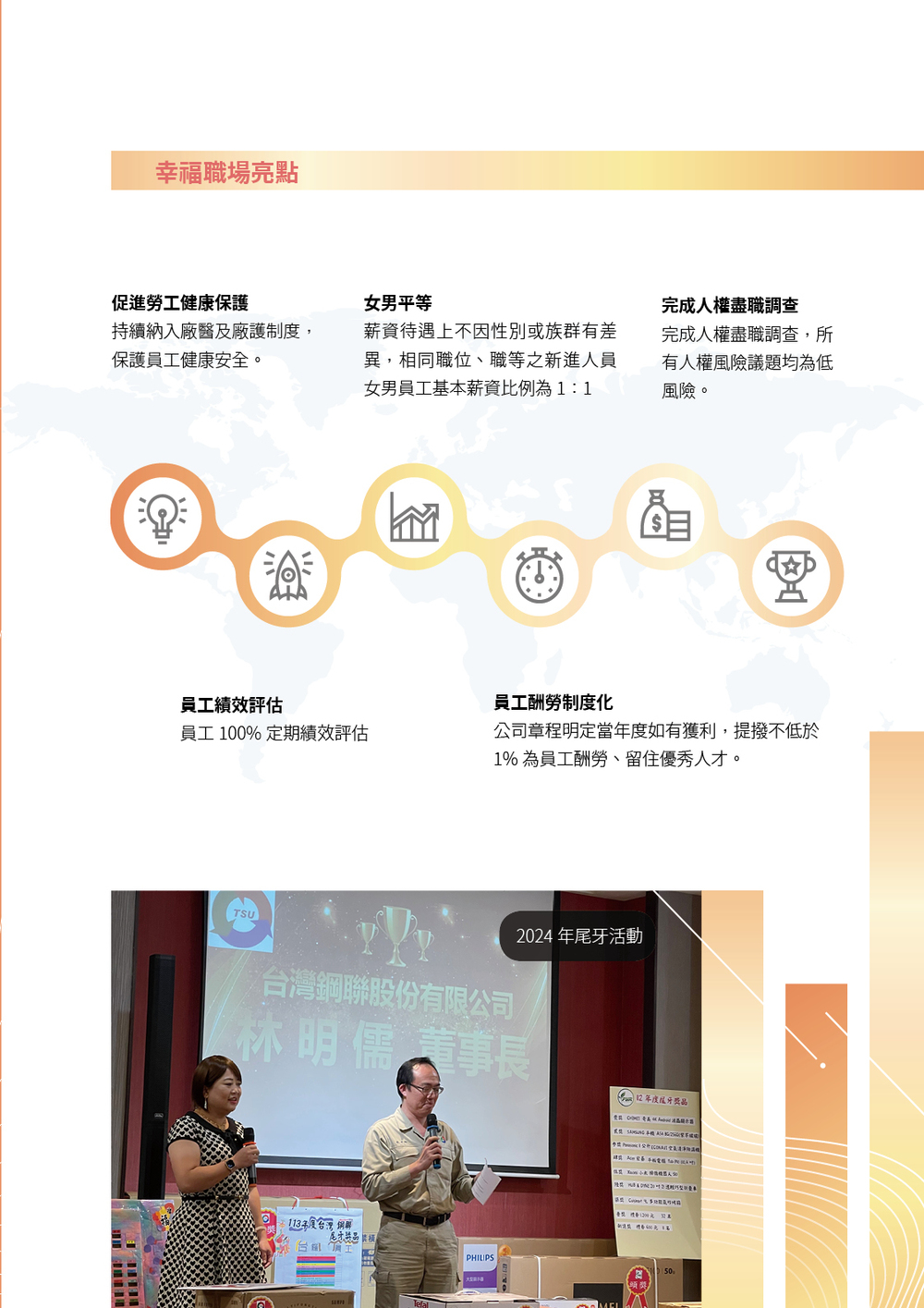管理方針及亮點 Home / 幸福職場 / 管理方針及亮點 選單管理方針及亮點 人力資源管理 人才吸引及留才 職業安全衛生 獎金政策 人權政策執行情形 幸福職場 公司治理 循環經濟 綠色製程 幸福職場 價值鏈管理 社會共融 ESG績效 管理方針及亮點 人力資源管理 人才吸引及留才 職業安全衛生 獎金政策 人權政策執行情形 下一篇: 人力資源管理 ESG績效 永續報告書 公司治理 經營者的話永續發展目標管理方針及亮點公司治理概況產品與經濟績效重大主題管理氣候變遷資安政策 循環經濟 管理方針及亮點循環經濟推手爐碴再利用新增廢棄物量能成長廢棄物管理鋼聯資源循環經濟貢獻上下游產業鏈共同參與 綠色製程 管理方針及亮點綠色製程系統環境政策與管理系統營運生態效率水風險管理環境監測及法規 幸福職場 管理方針及亮點人力資源管理人才吸引及留才職業安全衛生獎金政策人權政策執行情形 價值鏈管理 管理方針及亮點供應鏈管理運輸安全法規客戶關係管理 社會共融 管理方針及亮點社區衝擊評估社區關懷循環經濟教育